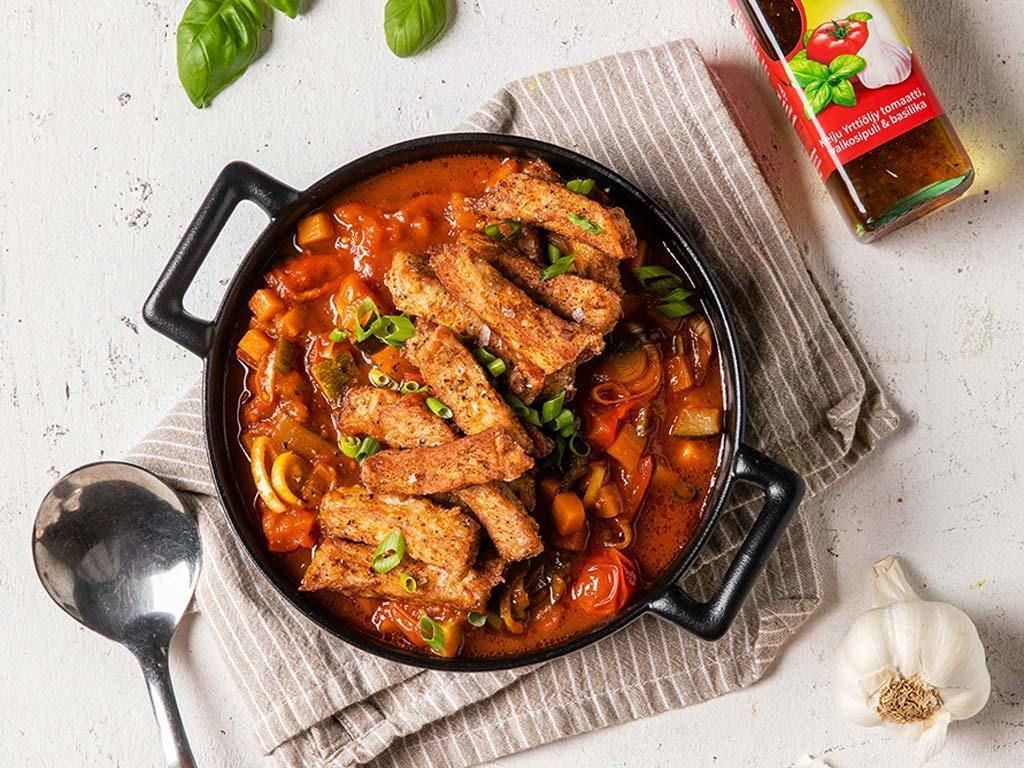 Täyteläinen haudutettu hapanimelä kasvispata on lounasruokaa parhaimmillaan. Kasvispadan kanssa maistuvat rapeaksi paistetut porsaanlihasuikaleet.