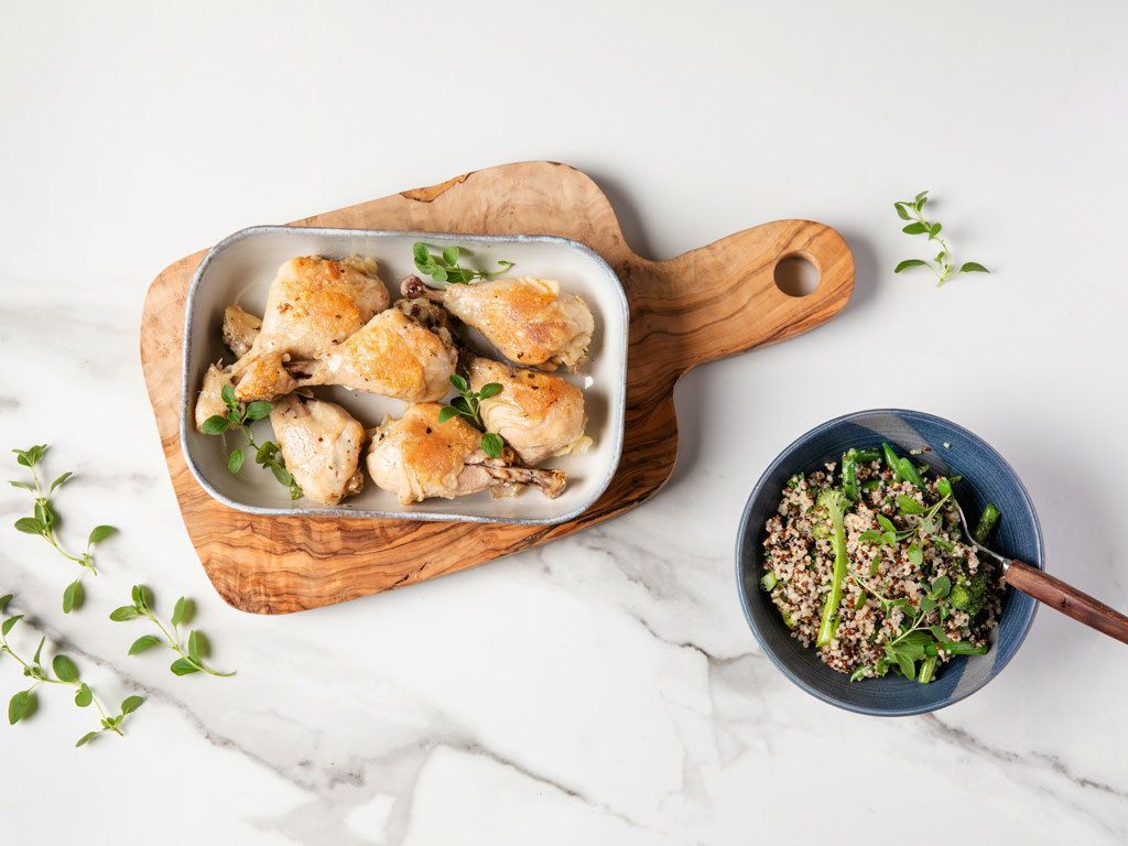 Matalassa lämmössä kypsennetyt broilerin koivet ja kasviskvinoa