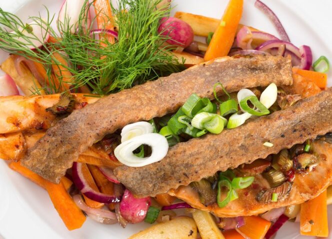 6. Kauli Kultasula ruisperunataikina n 0,5 cm ohueksi. Ota taikinasta n 2 cm levyisiä suikaleita. Aseta niitä kauniisti lohipalojen päälle missä on jo raparperiseos